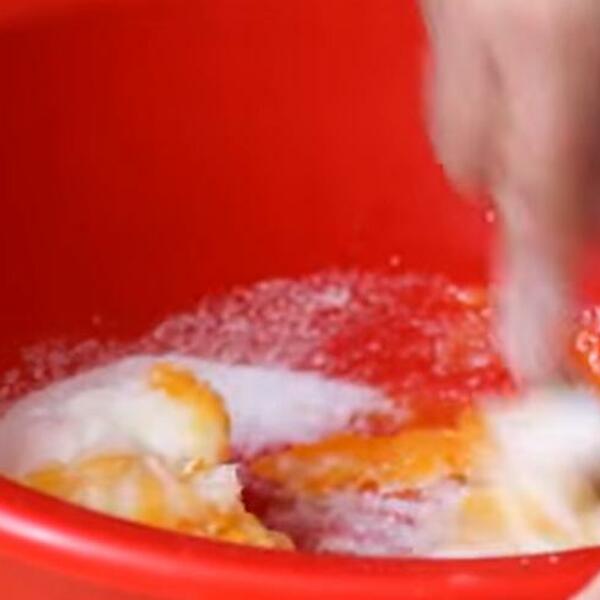 Žumance i šećer penasto umutite, pa dodajte margarin i brašno, prašak za pecivo i mleko i umutite dok smesa ne postane glatka.
