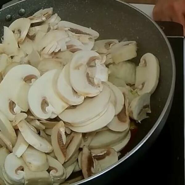 Pečurke, luk i praziluk sitno iseckati. U keramičkom ili teflonskom tiganju sipajte šolju vode i na njemu prodistajte luk, praziluk i prečurke. Začine dodajte po ukusu na kraju.