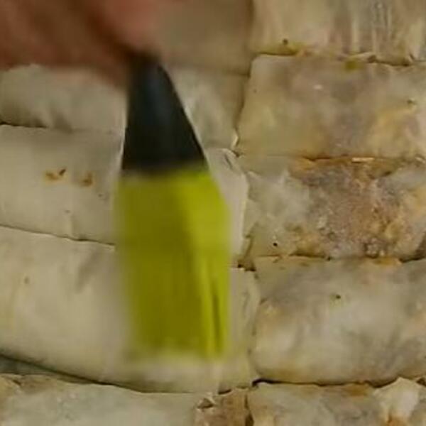 Kore iseći na tri jednaka dela i ređati jednu na drugu a između ih premazujte vodom, treću koru premazati pripremljenom smesom i saviti u trougao. Trouglove slagati na papir za pečenje. Peći na 200 stepeni, sve dok ne porumene. Kada je pečeno, obavezno prekriti vlažnom krpom da omekane.