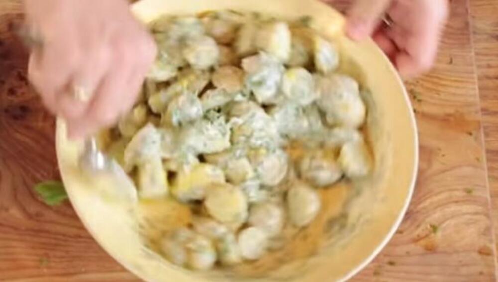 Sve lagano izmešajte, sve vreme pazeći da se krompir ne pretvori u pire.