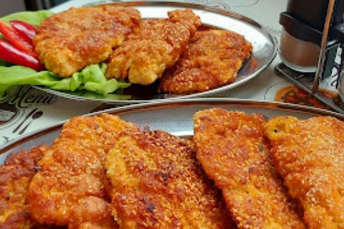 U teglicu sa rupicama sipati susam.Šniclu provući kroz brašno, jaja, prezle, jaja i posuti susamom.