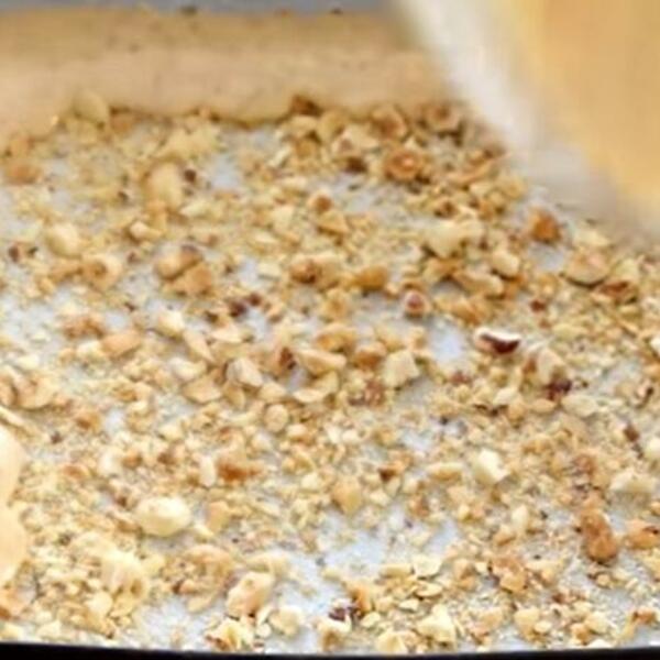 Na dno tepsije stavite pek-papir, po njemu rasporedite pečene lešnike, pa preko njih sipajte smesu za koru. Pecite koru na 220 stepeni dvadesetak minuta.