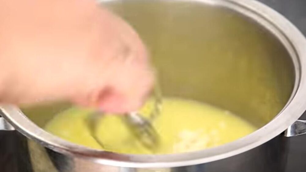 U šerpu sipajte 400 mililitara vode, dodajte šećer i ostavite da provri. U međuvremenu, umutite prašak za puding od čokolade sa preostalih 100 mililitara vode i kašikom brašna, pa zakuvajte tako da dobijete glatki krem. Ostavite krem da se ohladi, pa ga onda izmiksajte sa 250 grama margarina.
