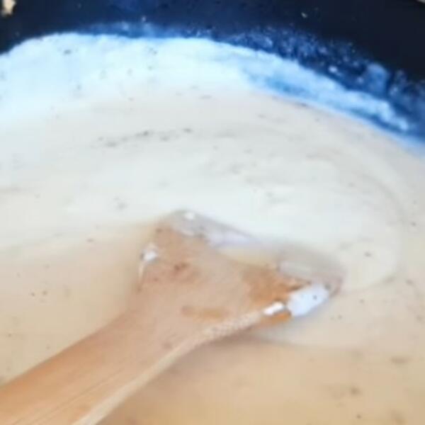 Dodati mleko i vodu i mešati da ne zagori, Iznešati pavlaku i sir pa ubaciti u sos i izjednačiti. Ubaciti suvi začin, origano mleveni biber i vratiti na šporet. Ubaciti meso i na veoma laganoj vatri prokrčkati minut dva.