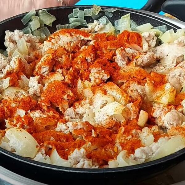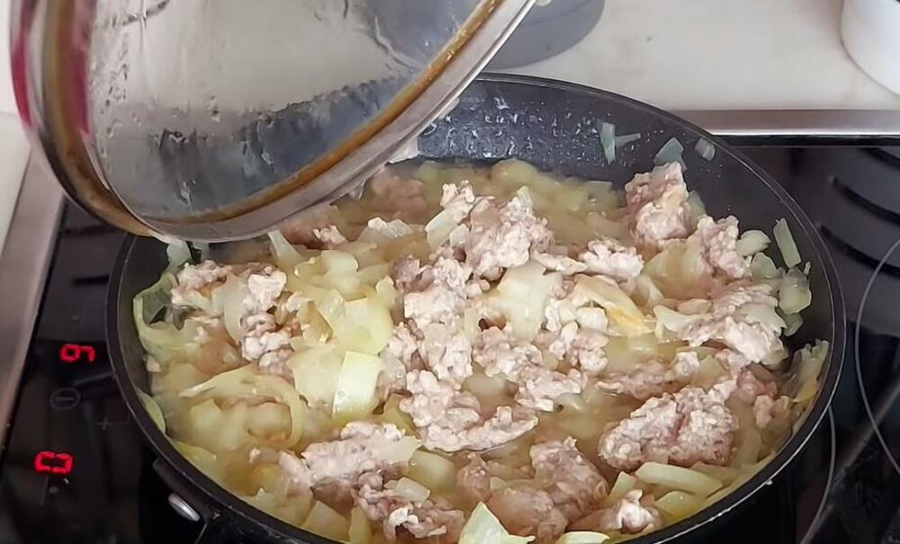 Luk iseći sitno pa propržiti i dodati mleveno meso. Izdinstati.