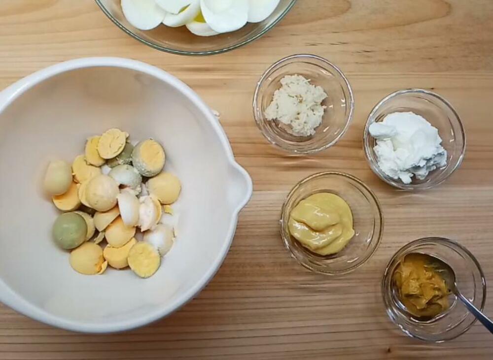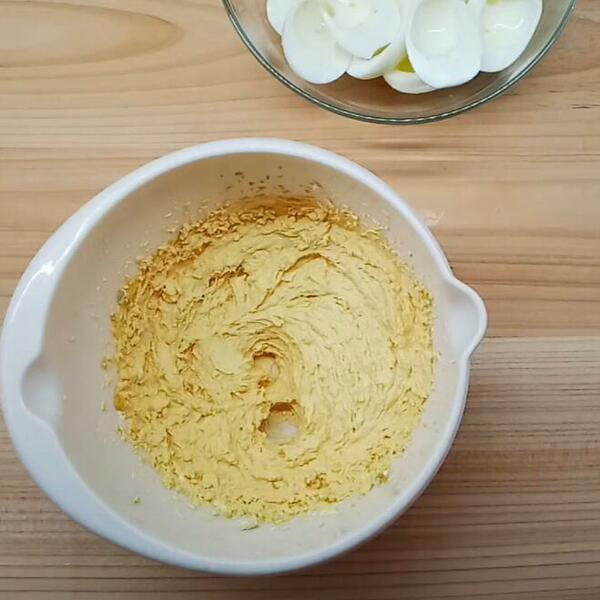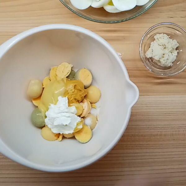 Jaja skuvati i ohladiti pod mlazom hladne vode. Oljustiti i preseci na pola. Izvaditi zumanca, propasirati kroz sito i izmesati sa sirom, snefom, majonezom i renom.