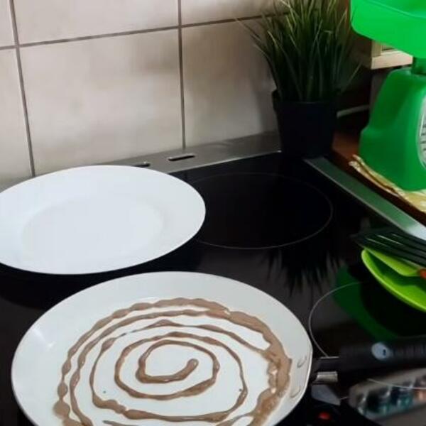 Zagrejte tiganj sa par kapi, zatim višak ulja prebrisati ubrusom, smanjite temperaturu na srednju i izlijte kutlaču smese. Po njoj odmah šararajte tamnom smesom (koristite kesu za šlag kojoj ste prethodno odsekli vrh).