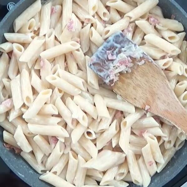 Sirovoj testenini dodajte naseckanu kuvanu šunku ili slaninu, promešajte.