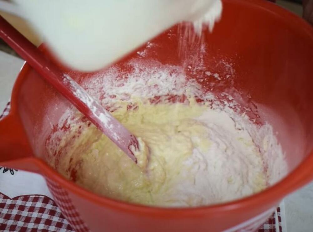 Spojiti kvasac i tikvicu, pa dodati jaja, ostatak mleka i vodu pa promešati.