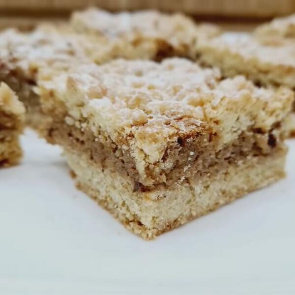 Kolač pecite u zagrejanoj rerni na 200 stepeni 10 minuta, a onda još 10 minuta na 180 stepeni. Kada je gotov, kolač izvadite iz rerne i ostavite da se prohladi, a onda ga secite na kocke željene veličine i pospite šećerom u prahu.