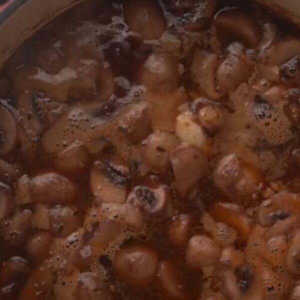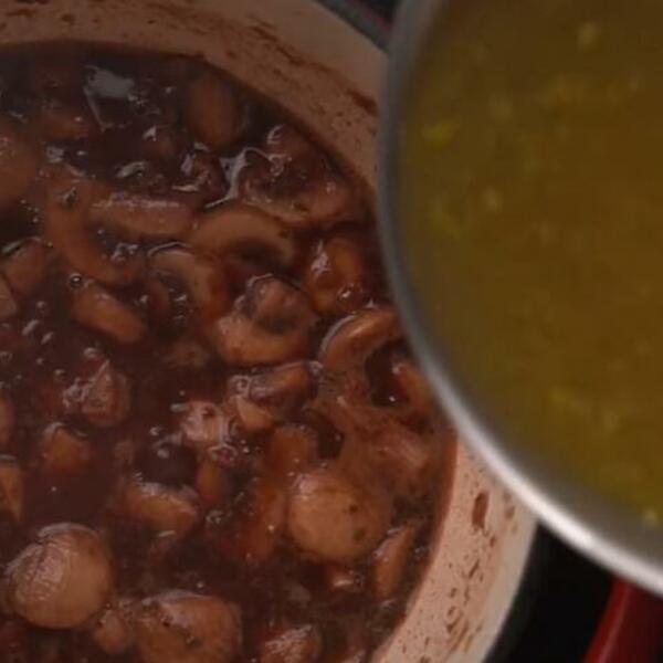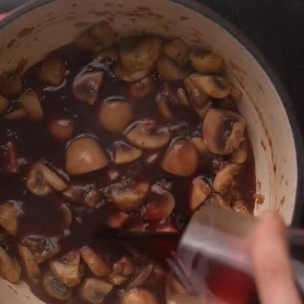 U manjoj posudici otopite preostali maslac pa dodajte luk i pržite otprilike pet minuta dok ne omekša. Dodajte beli luk i pržite ga otprilike minut pa ubacite pečurke i dinstajte dva minuta. Zatim sipajte crveno vino.