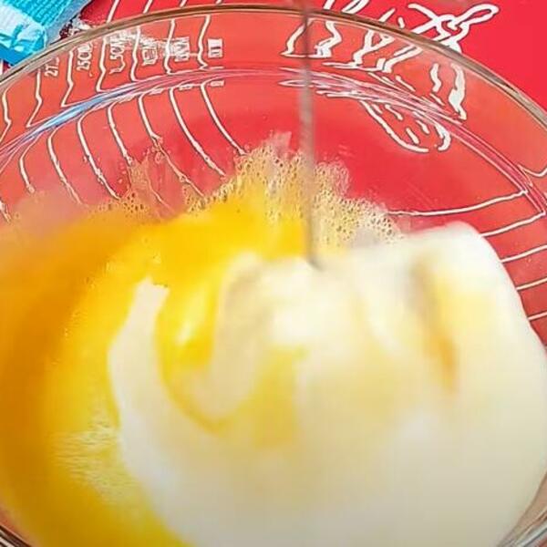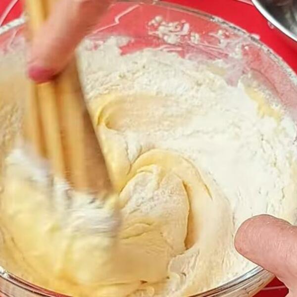Umutiti jaja, dodati malo soli. Jogurt, brašno dodavati i mešati običnom žicom ili varjačom. Testo treba da bude ređe i da otpada sa varjače u komadima.