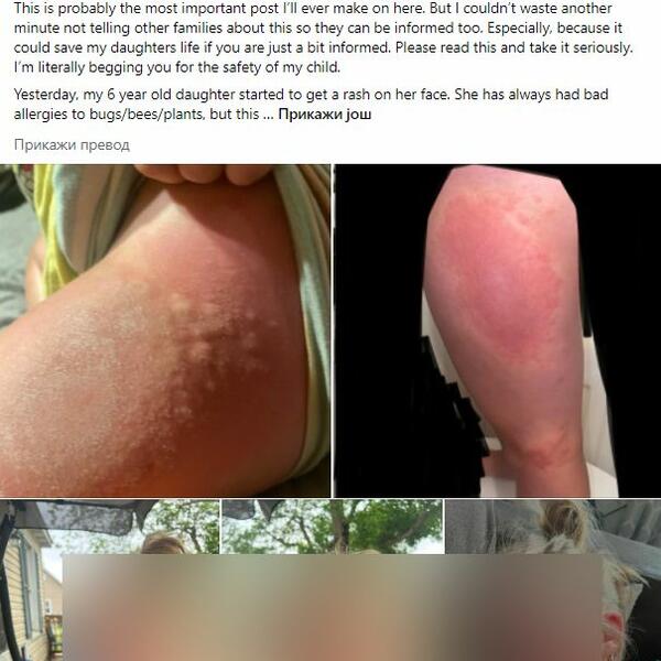 "Juče je moja šestogodišnjakinja počela da dobija osip po licu, a oduvek smo se borili sa teškim alergijama na bube, pčele i prolećne biljke, ali ovakav slučaj još nismo videli, jednostavno se prebrzo širilo."