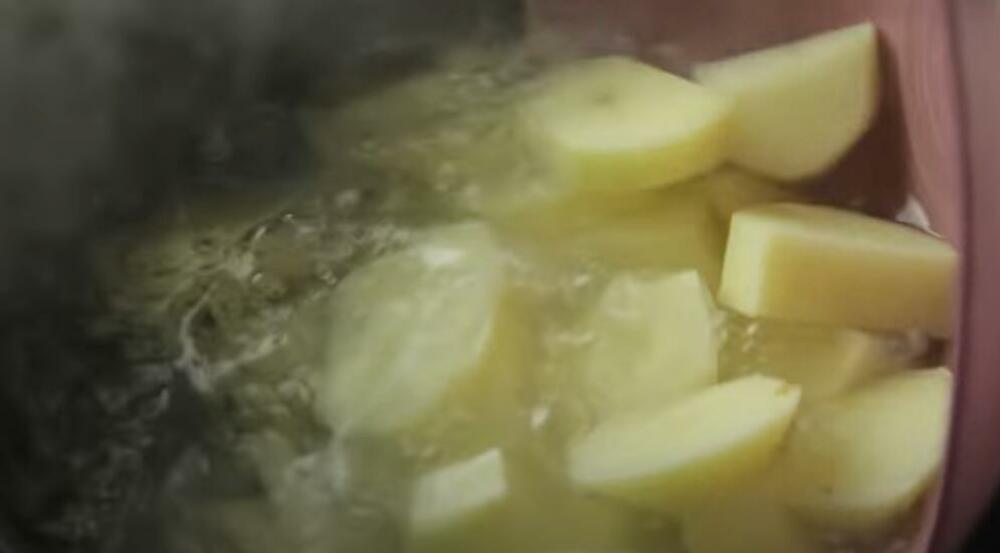 Pripremite i kuvajte krompir. Stavite krompir naseckan na kockice u veliko cedilo i isperite hladnom vodom dok voda ne bude bistra. Prebacite u šerpu i dodajte vodu da prekrije krompir. Dobro posolite vodu. Pustite da provri na jakoj vatri, a zatim smanjite vatru na srednje-nisku i kuvajte oko 10 do 15 minuta ili dok se krompir dobro ne skuva. Krompir ocedite u istu cediljku i ponovo isperite, ovoga puta vrelom vodom, 30 sekundi. Krompir ostavite na stranu 5 do 7 minuta kako bi višak vlage ispario.
