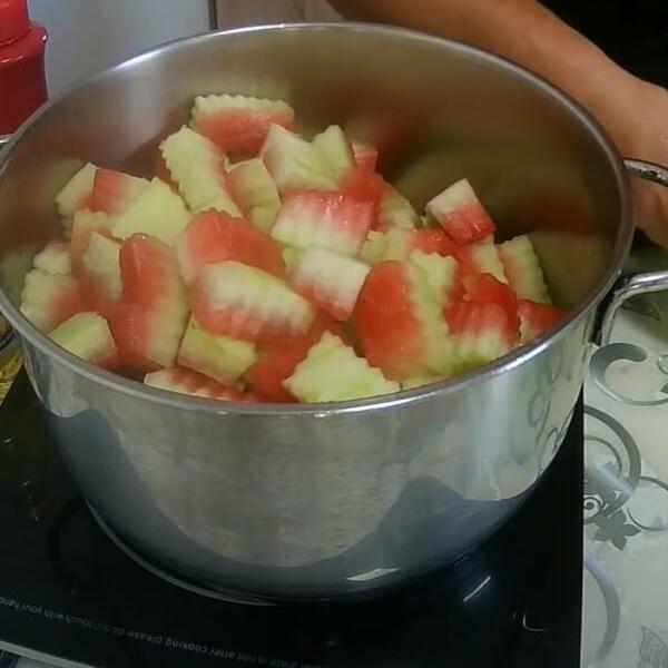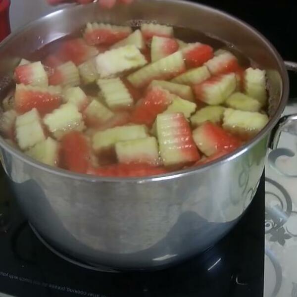 Nakon što u 9 voda skuvate kockice lubenice i ostavite ih sa strane, u šerpu ulijte litar vode i postepeno dodajte šećer neprestano mešajući (na ovaj način će se šećer lepo rastopiti, bez grudvica). Kada provri, ostavite da se špinuje oko 30 minuta. Nakon toga dodajte kockice i neka se kuva oko sat vremena. Na pola kuvanja dodajte limun isečen na kolutiće i rozetlu. Kada se slatko potpuno ohladi, sipati u tegle.