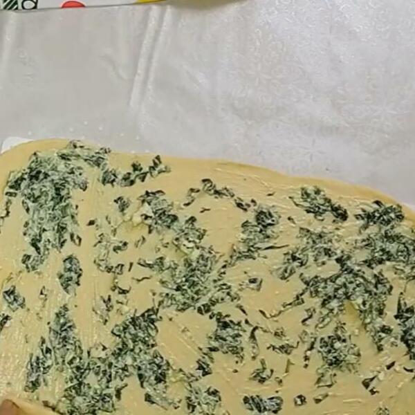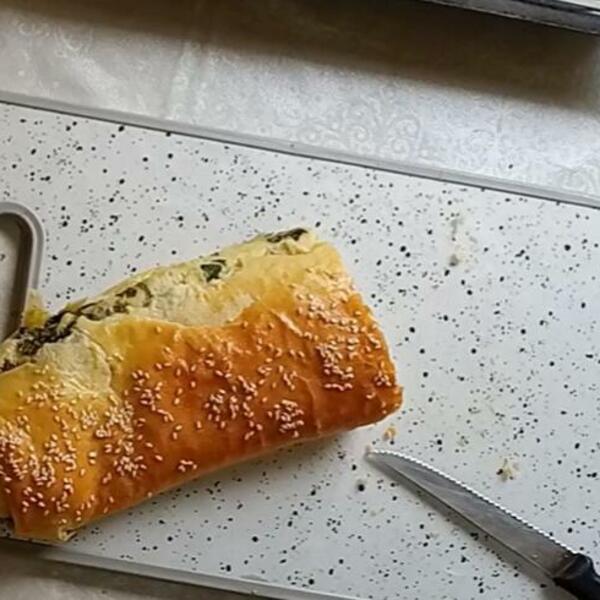 Dva lista lisnatog testa rastanjite, na svaki nanesite polovinu nadeva i uvijte kao štrudlu. Krajeve testa pritisnite kako fil ne bi cureo.