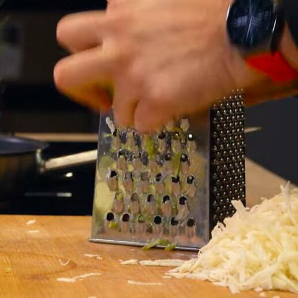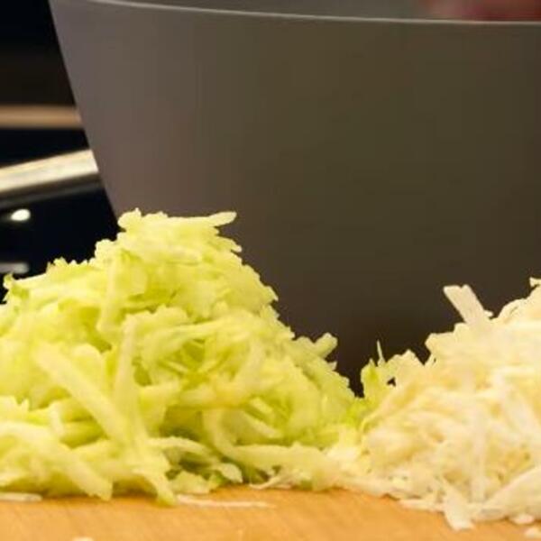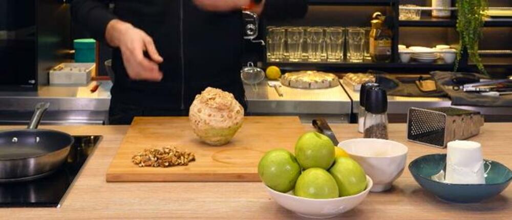 Jabuku i celer oljuštite. Jabuku očistite od semenki i isecite je na kockice, a celer krupno narendajte.