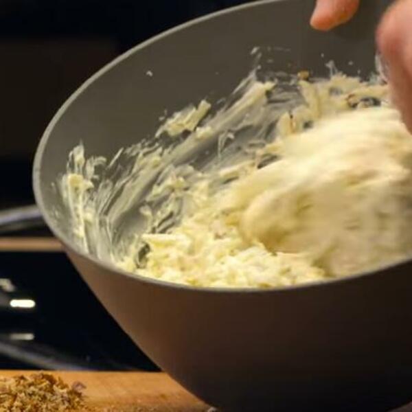 Dobro sjedinite i stavite da se ohladi. Salatu pre služenja pospite krupno seckanim orasima.