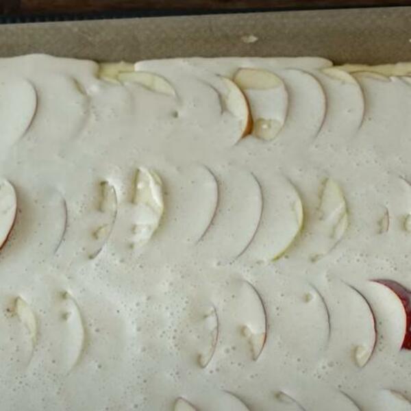 Sjedinite mikserom. Sipajte u pleh obložen pek papirom i poravnajte. Jabuke očistite i isecite na kriške, pa poređajte po testu. Kiselu pavlaku umutite sa jajima, šećerom i cimetom. Sipajte preko jabuka. Pecite na 180°C oko 35 minuta.
