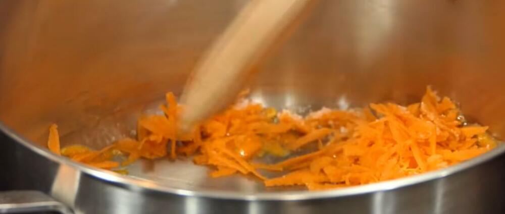 Crni luk i šargarepu iseckajte, pa pržite 2-3 minuta na ulju/masti koje ste zagrejali u šerpi.