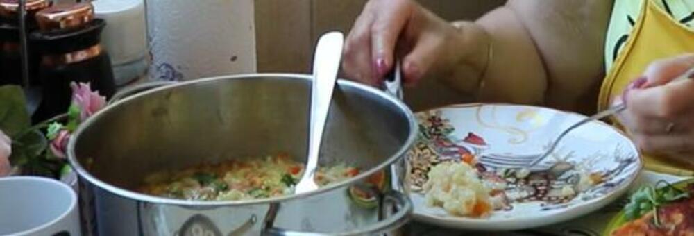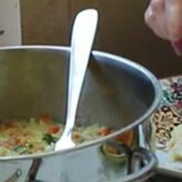 Na ulju propržiti seckan luk i šargarepu iseckanu na sitne kockice, dodati papriku pa ubaciti 50 g opranog pirinča.