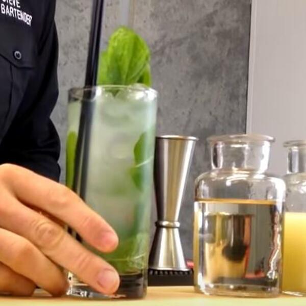 šest listova nane šest svežih malina 60 ml ruma 30 ml soka od limete 30 ml šećernog sirupa 100 ml kisele vode kockice leda