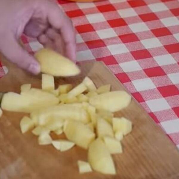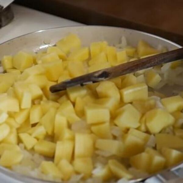 Povrće operite i isecite na kockice. Najpre na ulju ispržite krompiriće, a zatim njih prebacite na tanjir i na tom istom ulju ispržite luk i papriku. Posle nekog vremena dodajte paradajz. Posolite i promešajte.