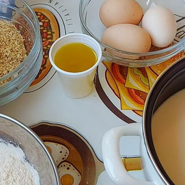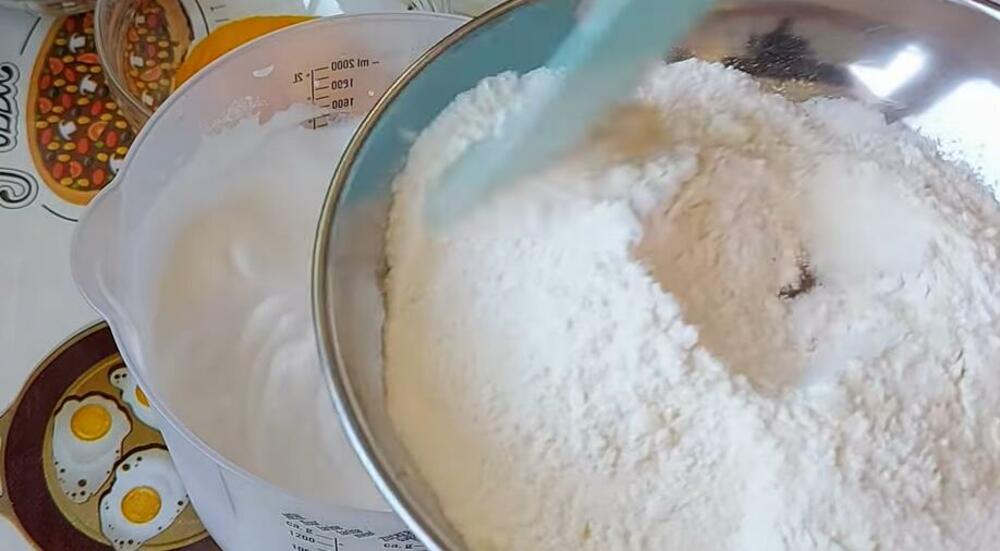 Umutiti jaja sa šećerom, dodati sve nabrojane sastojke. Dobro izjednačiti, pa sipati u podmazan pleh veličine 22 cm .
