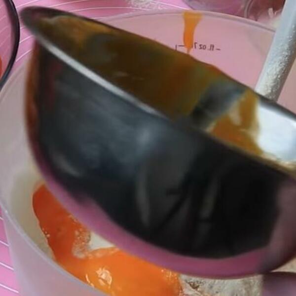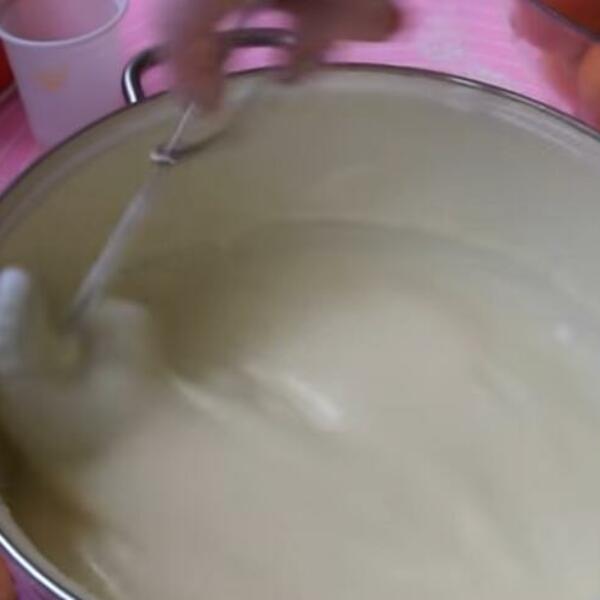 Umutiti jaja sa šećerom, dodati brašno sa praškom za pecivo, mlevenu plazmu, ulje, kiselo mlekoi sve dobro izmešati.