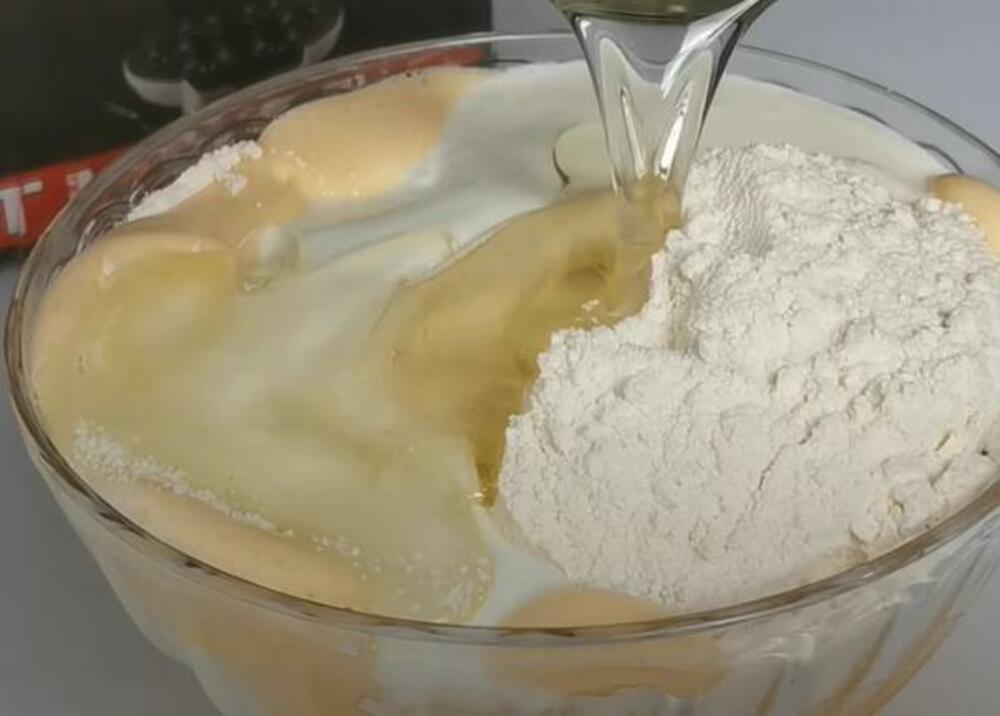 - Zatim dodati ulje, jogurt, vanil šećer i prašak za pecivo pomešano sa brašnom. Sve dobro sjediniti.