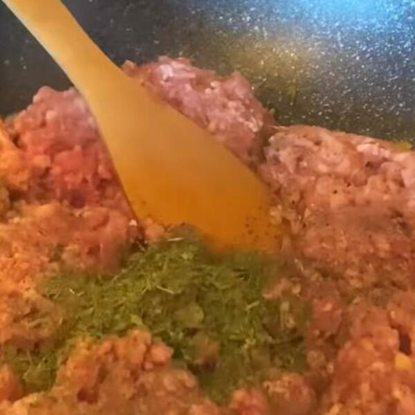 Luk sitno iseckajte i prodinstajte na malo ulja i vode. Kada postane staklast, dodajte mleveno meso i začine prema ukusu. Mesto kratko ispržite i sklonite sa vatre.