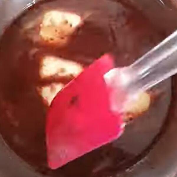 Kocke ispečenog patišpanja viljuškom spuštajte u preliv od vode, šećera i kakao-praha, pa odmah zatim u posudu sa kokosovim brašnom.