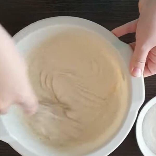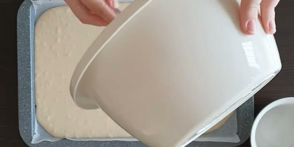 U činiji pomešajte pšenično brašno, griz, 200 grama šećera, prašak za pecivo i vanilin šećer. Potom dodajte 200 mililitara vode i kašiku alkoholnog sirćeta. Sve dobro umutite, pa sipajte u pleh obložen pek-papirom i pecite na 200 stepeni dok se patišpanj ne odvoji od ivica pleha.