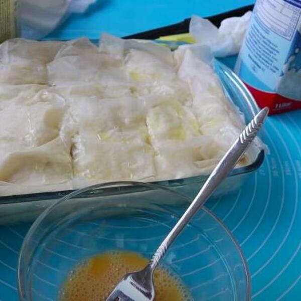 Izdrobiti sir, dodati jaja, jogurt ,kiselu vodu ulje i prašak za pecivo i sve izjednačiti. Tepsiju 30x20 obložiti pek papirom. Na dno raširiti dve kore i premazati uljem stranice kora i ostaviti da vise preko tepsije. Svaku koru blago uronuti u fil pa ređati u tepsiju jednu do druge..