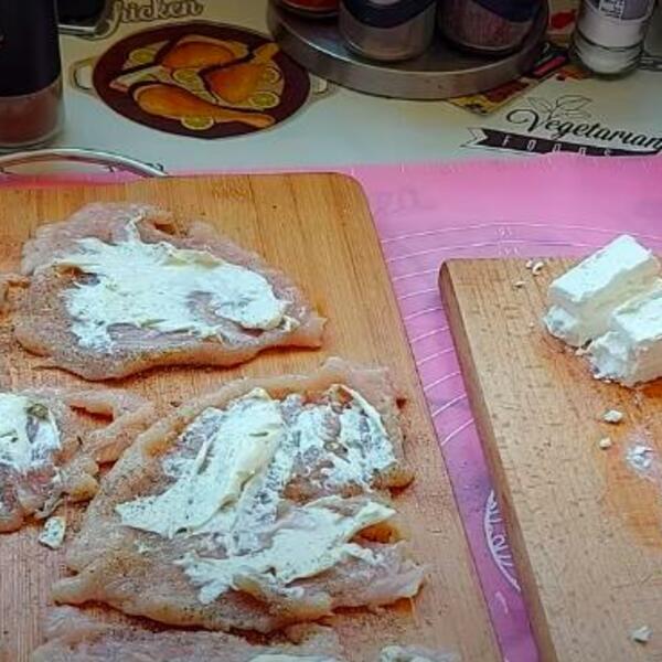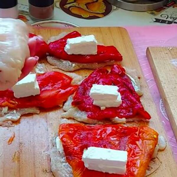 Svaki filet premazati sirnim namazom pa dodati listove paprika. Preko staviti sir feta i uviti u rolat, rolnice provući kroz brašno umućena jaja i prezle.