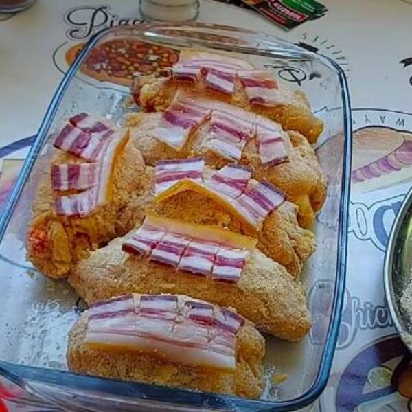 Ređati u podmazan pleh pa odozgo staviti listove slanine.