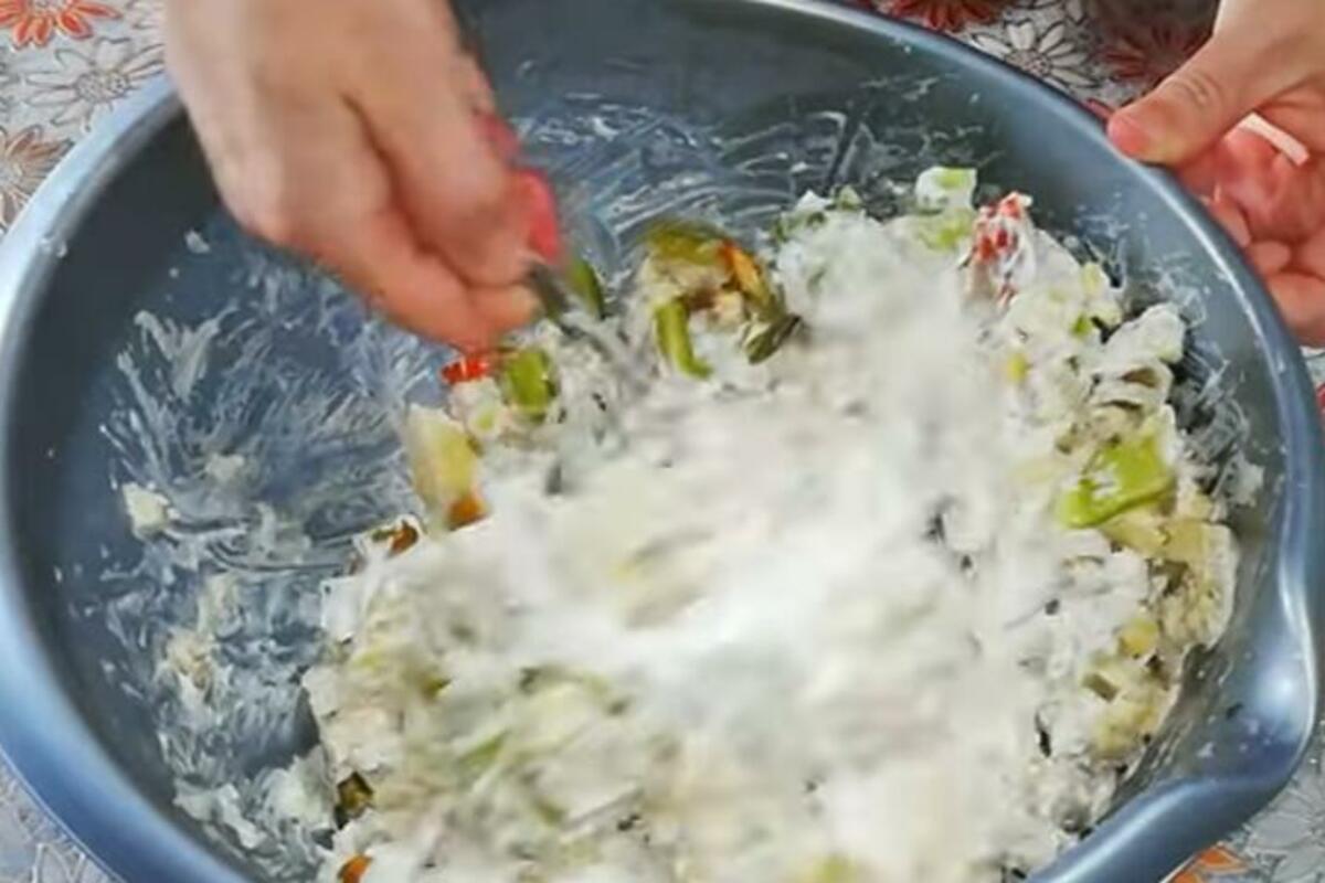 Stavite kriške krastavca i luka u posudu s prelivom. Začinite solju i paprom po ukusu, promešajte i uživajte.