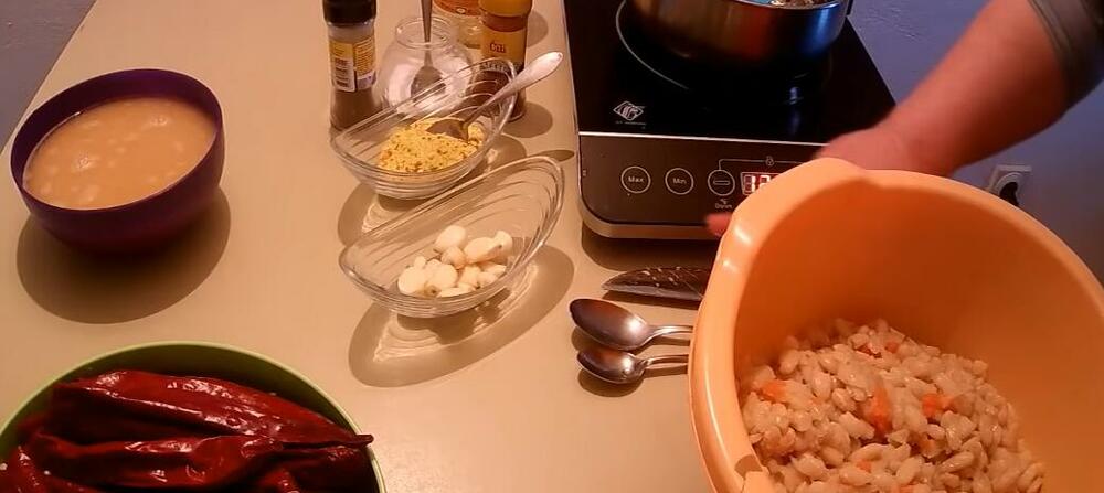 Dodati obaren pasulj, pasiran beli luk, seckane orahe, mlevenu papriku i začine po ukusu, i sve to promešati.