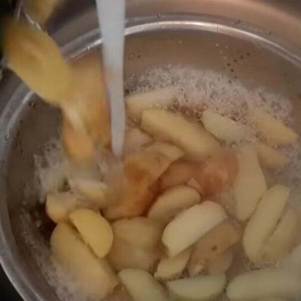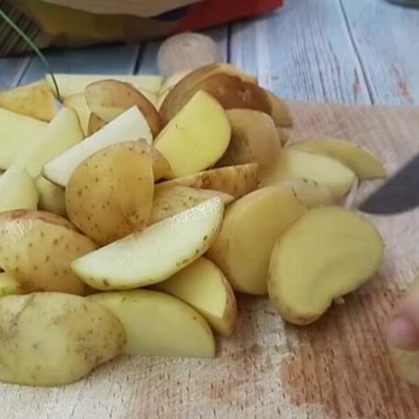 1. Uključiti rernu da se greje na 200 stepeni. Krompir oljuštiti, ili samo dobro oprati sa ljuskom zajedno, pa iseći na deblje kriške.