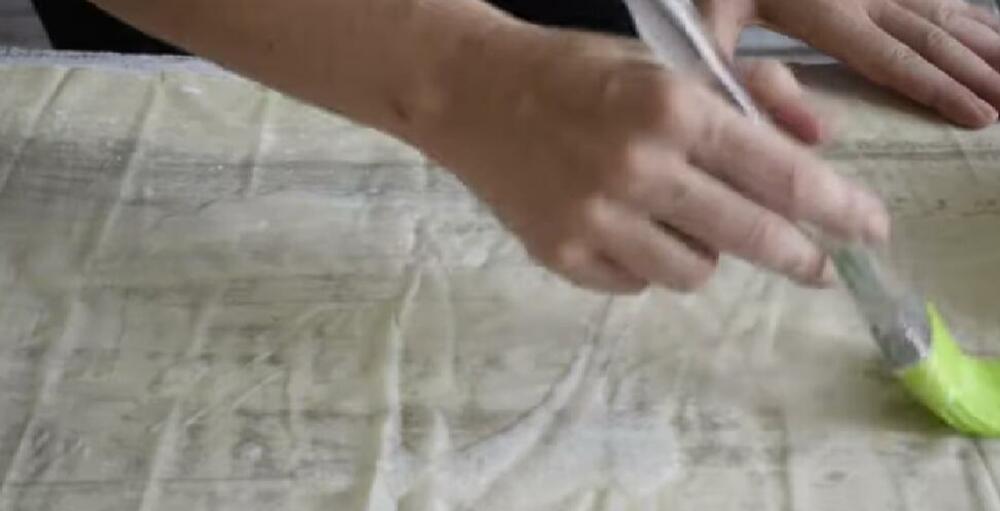 Na papir za pečenje stavite jednu koru, zatim je premažite otopljenim maslacem, pa na nju stavite drugu koru. Postupak ponovite sa narednih pet kora. Kore slažite tako da se ne preklapaju već da rubovi stoje pomalo neuredno.