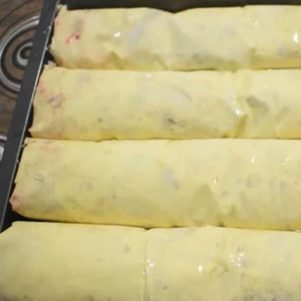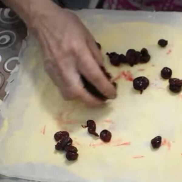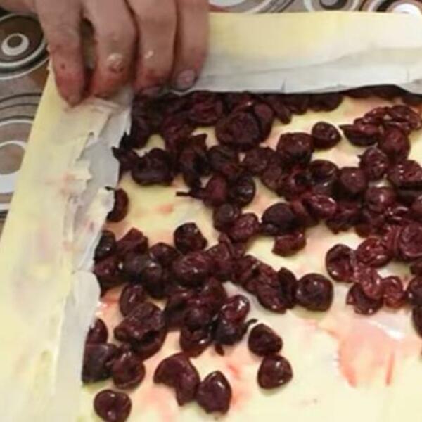 Razdvojiti kore po 3 komada. Filom se mažu prva i druga kora, a na treću se ređaju samo višnje. Višnje ređati u red širine oko 3,4 cm. Saviti krajeve i urolati koru. Ređati u pleh i peći na 200 stepeni oko 45 minuta.
