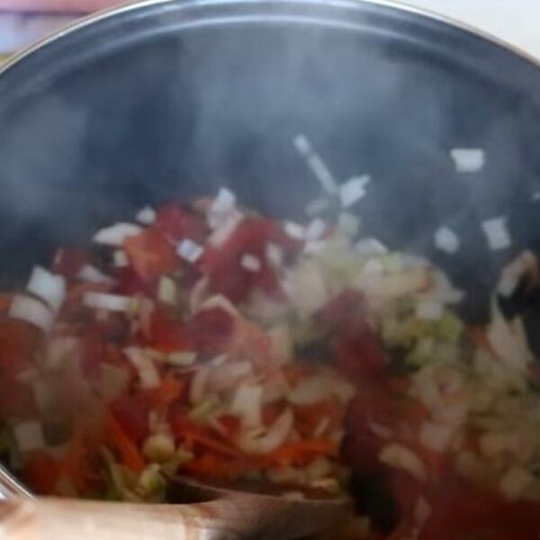 Promešati i dodati krompir sečen na kockice, kašiku aleve paprike, kašiku biljnog začina, soli i bibera po ukusu. Promešati pa sve naliti sa dve litre vode. Kuvati poklopljeno jedan sat. Pri kraju kuvanja dodati rezance i sačekati da se skuvaju. Čorbu skinuti sa vatre, začiniti pavlakom i posuti peršunom.
