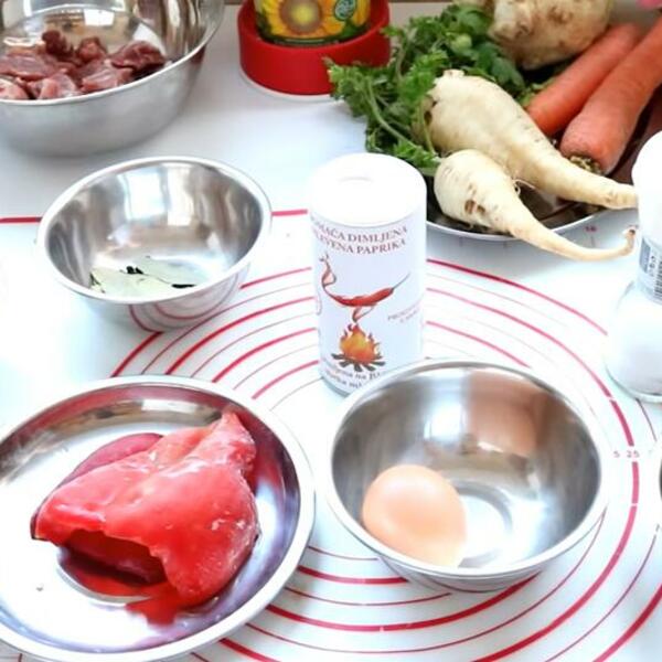 Meso iseckati što sitnije, staviti u lonac sa seckanim crnim lukom i dinstati na malo ulja. tokom dinstanja mešati i dolivati manje količine vode. Kad meso omekša, pustiti da voda ispari, pa dodati šargarepu i koren peršuna - sečene na kolutove.