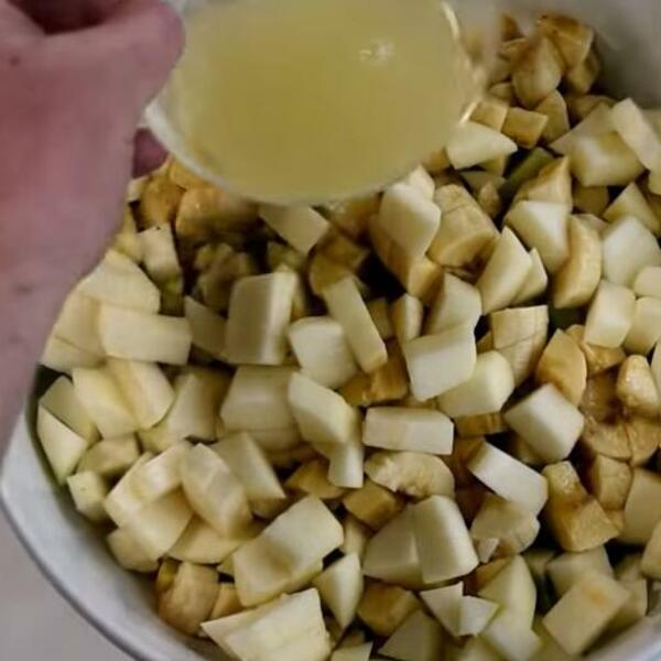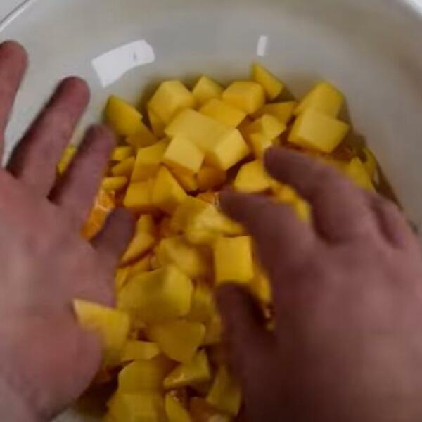 Oprane breskve očistite i iseckajte na kockice. Umutite slatku pavlaku. Keks izmrvite, pa pomešajte sa krupno mlevenim lešnicima i bademima.