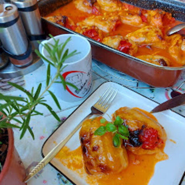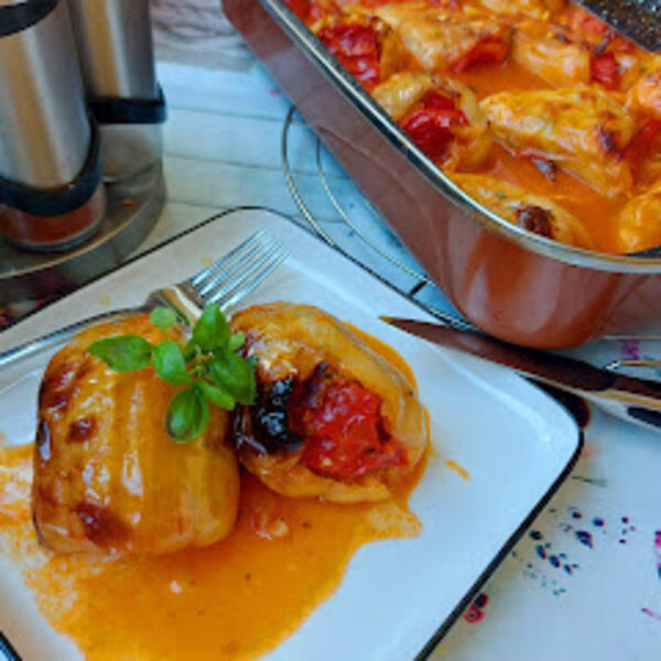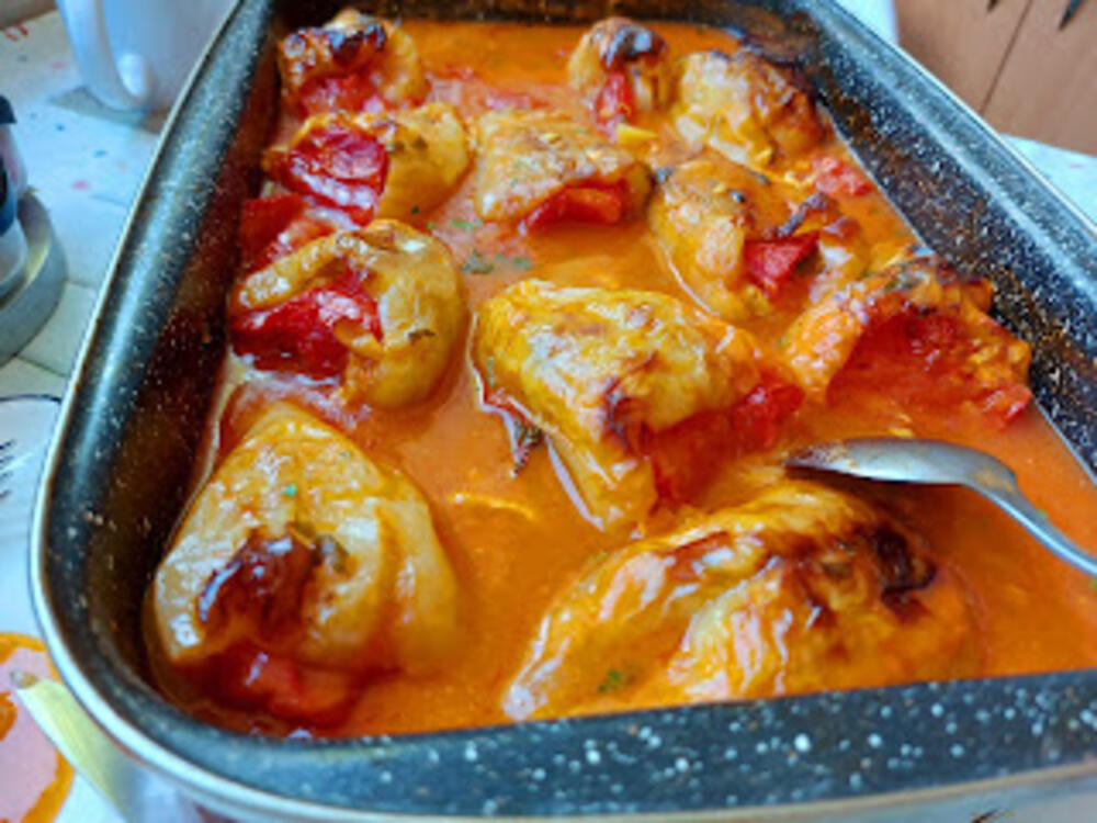 Ređati u plepodmazan pleh. U 200 ml vode dodati paradajz i kašiku brašna i sipati u pleh sda paprikom.