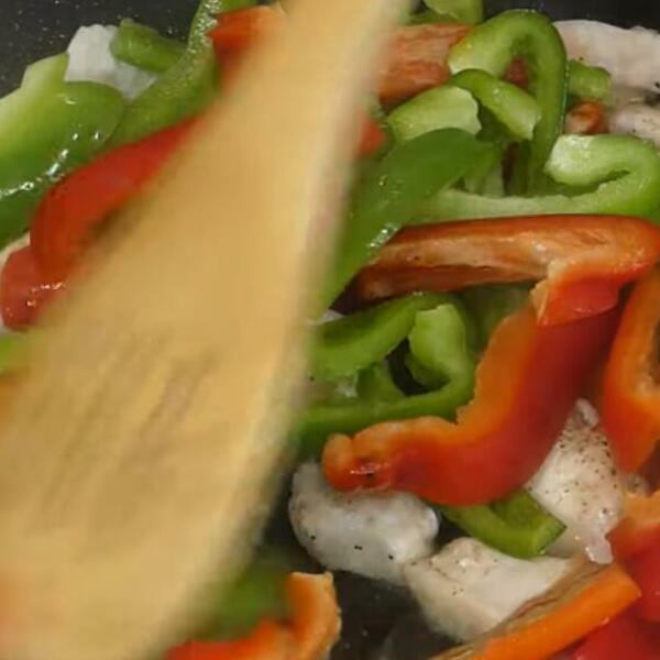 Pileća prsa iseckajte i propržite. Dodajte so i biber. Iseckajte paprike i dodajte ih u tiganj sa mesom. Pržite dok paprika ne omekša.