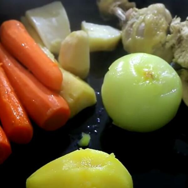 Sitno naseckajte luk i malo ga prodinstajte na ulju da bude staklast. Kada je gotov, prelijte ga sa pola šoljice vode i pustite da voda ispari. Kada je voda isparila, ponovo sipajte pola šolje vode i pustite da ispari. Na ovaj način luk neće plivati po čorbi. Potom u luk dodajte naseckano meso i propržite ga. Kada je meso gotovo dodajte krupnije isečenu šargarepu i peršun, celer i paštrnak.