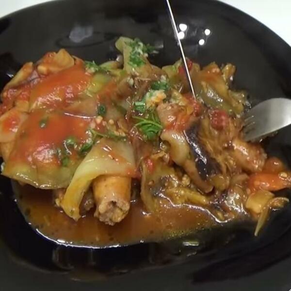 U tepsiju ili vatrostalnu činiju slažite red paradajz sosa preprženog sa lukom, pa red patlidžana, red paprika, red peršuna, red kobasica i slažite dok ne istrošite materijal, a zatim prelijte sa paradajz sosom i ostavite 10 minuta da se ukrčka.