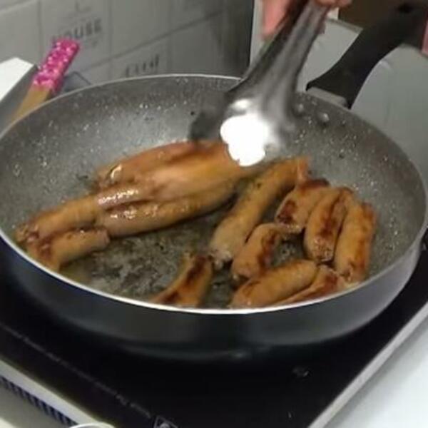 Očistite i poslolite, a zatim isecite patlidžan na kriške. Prepržite ga na ulju. Zatim ga sklonite sa strane, a u tom istom tiganju ispržite paprike koje su isečene na trake. Posle njih isecite kobasice pa ih ispržite.