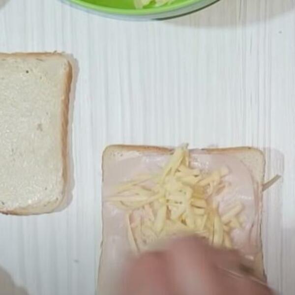 Na jedno parče hleba namažite tanko majonez, a na drugo tanko kečap. Na krišku koja je premazana majonezom stavite rendani kačkavalj, pa stavite narendanu šunku i zalepite kriškom koja je premazana kečapom.